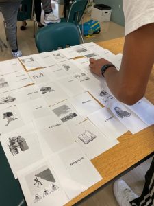 A student matches English words with pictures.