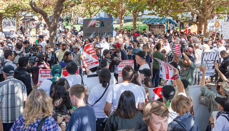 Protesters and supporters of Donald Trump and Milo Yiannopoulos fill Sproul Plaza at UC Berkeley, September 24, 2017. Photo Credit: Pax Ahimsa Gethen/Wikimedia Commons.