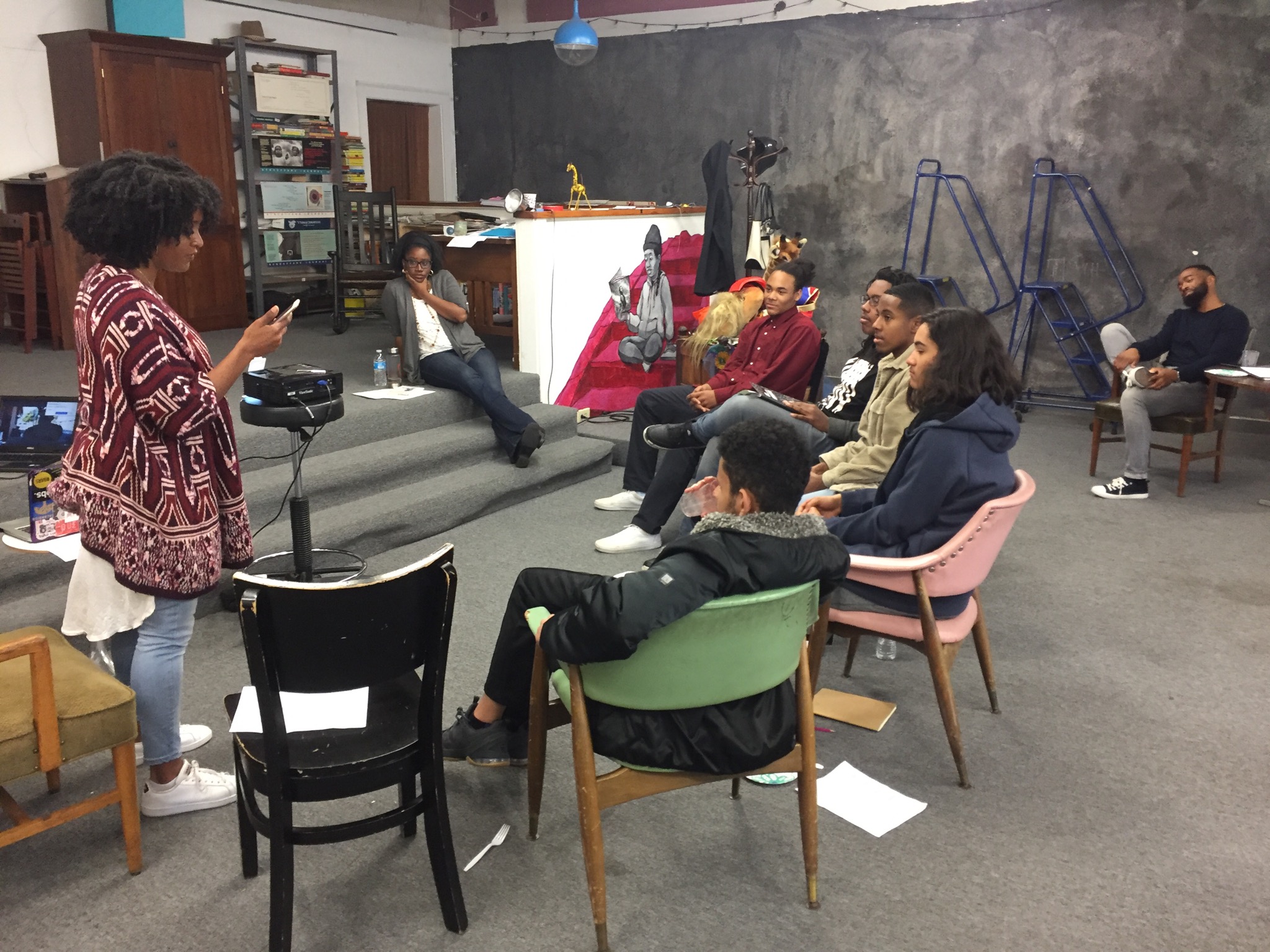 Ryan Nicole Peters works with students in the Black Joy writing program as part of Sights & Sounds of East Oakland.