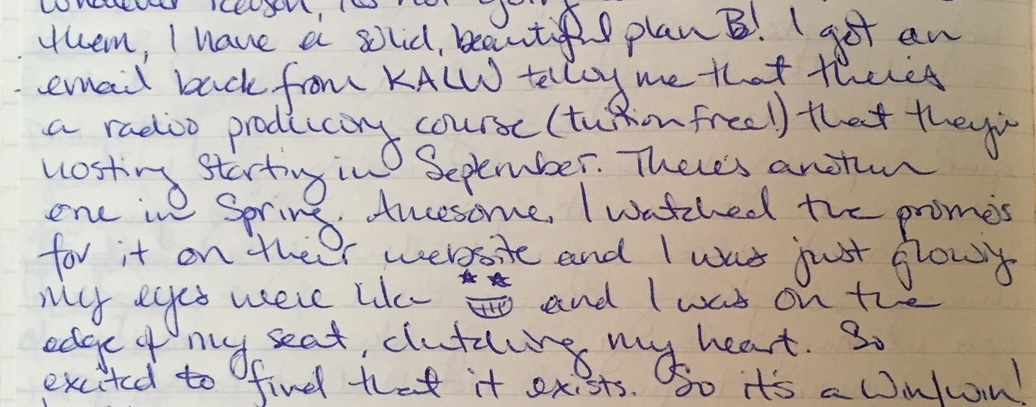 I learned about the Audio Academy a couple of years ago. I had reached out to the station to see about intern or volunteer opportunities, and they told me about the program. Here’s what I wrote in my journal: “I got an email back from KALW telling me that there’s a radio producing course (tuition free!) that they’re hosting starting in September. There’s another one in spring. Awesome. I watched the promos for it on their website and I was just glowing. My eyes were like “WOW” and I was on the edge of my seat, clutching my heart. So excited to find that it exists.”