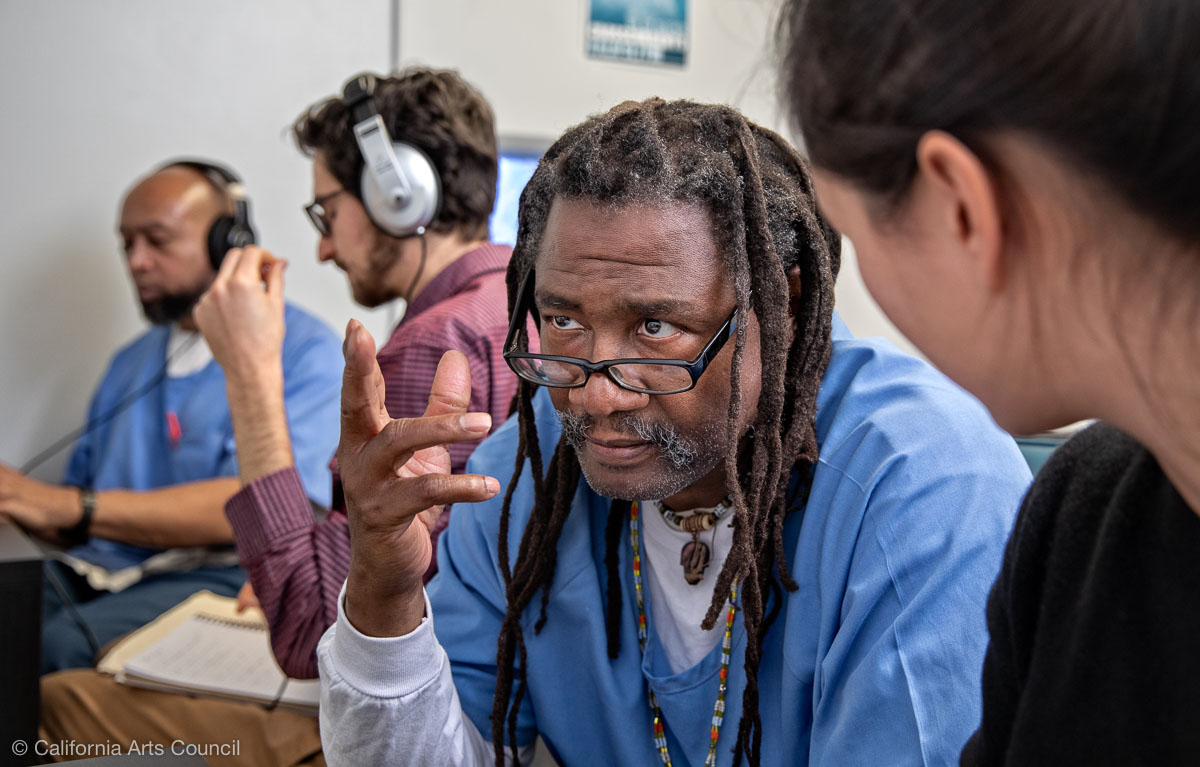 First, on Friday, I joined KALW‘s transportation reporter, Eli Wirtschafter, at Solano State Prison in Vacaville, where he trains incarcerated men to produce audio stories that air on our station under the title Uncuffed. The program is situated in the media lab in the education department, where KALW has set up a makeshift recording studio and three editing stations. We worked with six guys, talking about how the program is evolving (and may end up on more stations), listening to a story our justice reporter made about a reunion of released citizens and prison guards on Alcatraz, and then editing pieces. The energy is really amazing, the students are extremely engaged, and it’s really a pleasure to work with the men and hear their stories.
