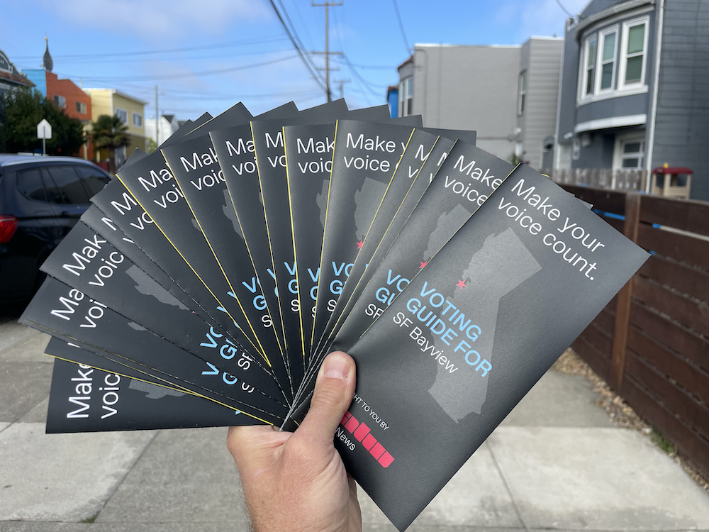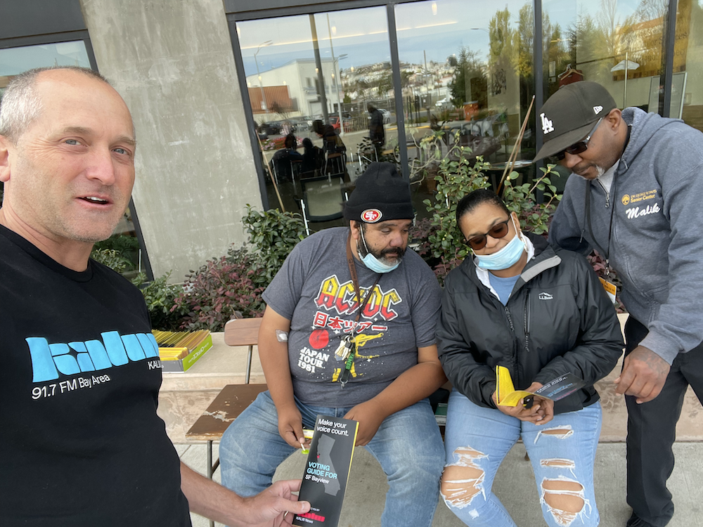 In the lead up to that, aside from broadcasting election-related stories, we’ve been visiting historically low voter turnout precincts of San Francisco, Alameda, San Mateo, and Contra Costa Counties. We’ve printed up 6,000 voter information guides, designed by Audio Academy alum Chris Egusa (’20) that volunteers are handing out door to door: