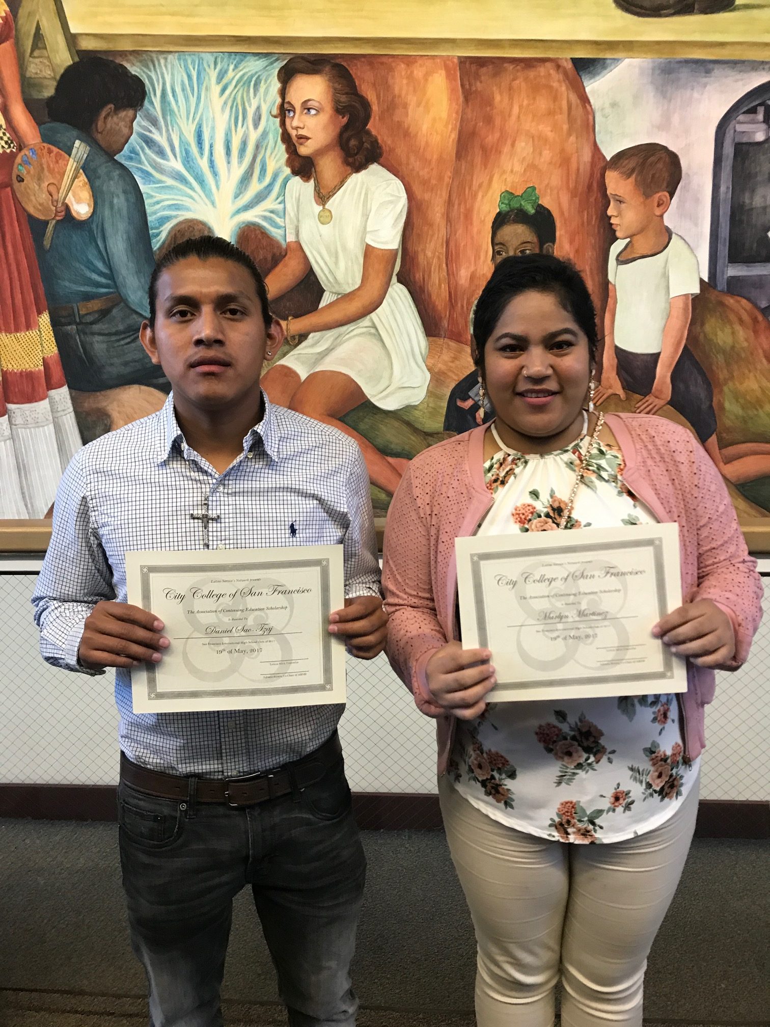 During the ceremony, they awarded Marlyn Martinez (SFIHS Class of 2013) and Daniel Sac-Tzaj (SFIHS class of 2017) each a $1,000 scholarship, thanks to ACE. These students were chosen because of their financial need and academic achievement. Marlyn is one year away from completing her degree at CCSF and Daniel has completed seven units this semester through the Early College program, and will be a full-time student in the fall. He is graduating from SFIHS this spring.