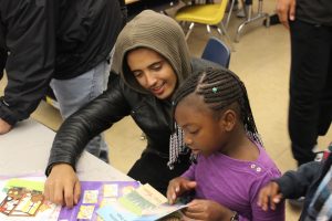 Literacy can start in the community. Partnering with researchers from Stanford and CSU East Bay, OIHS students are investigating how to become better community members by using literacy as the lead. They work with elementary school students at a nearby school and read social justice-themed books with the younger students.