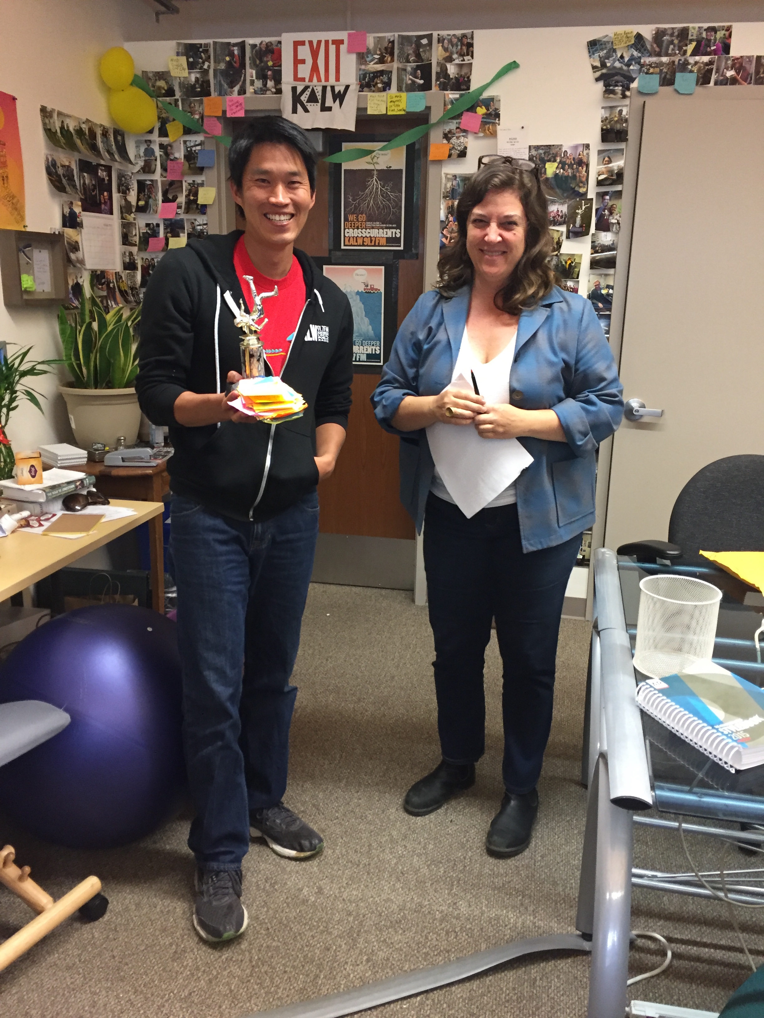 Jeremy Jue win’s KALW’s daily award for tracking his whole show with his editor Lisa Morehouse.