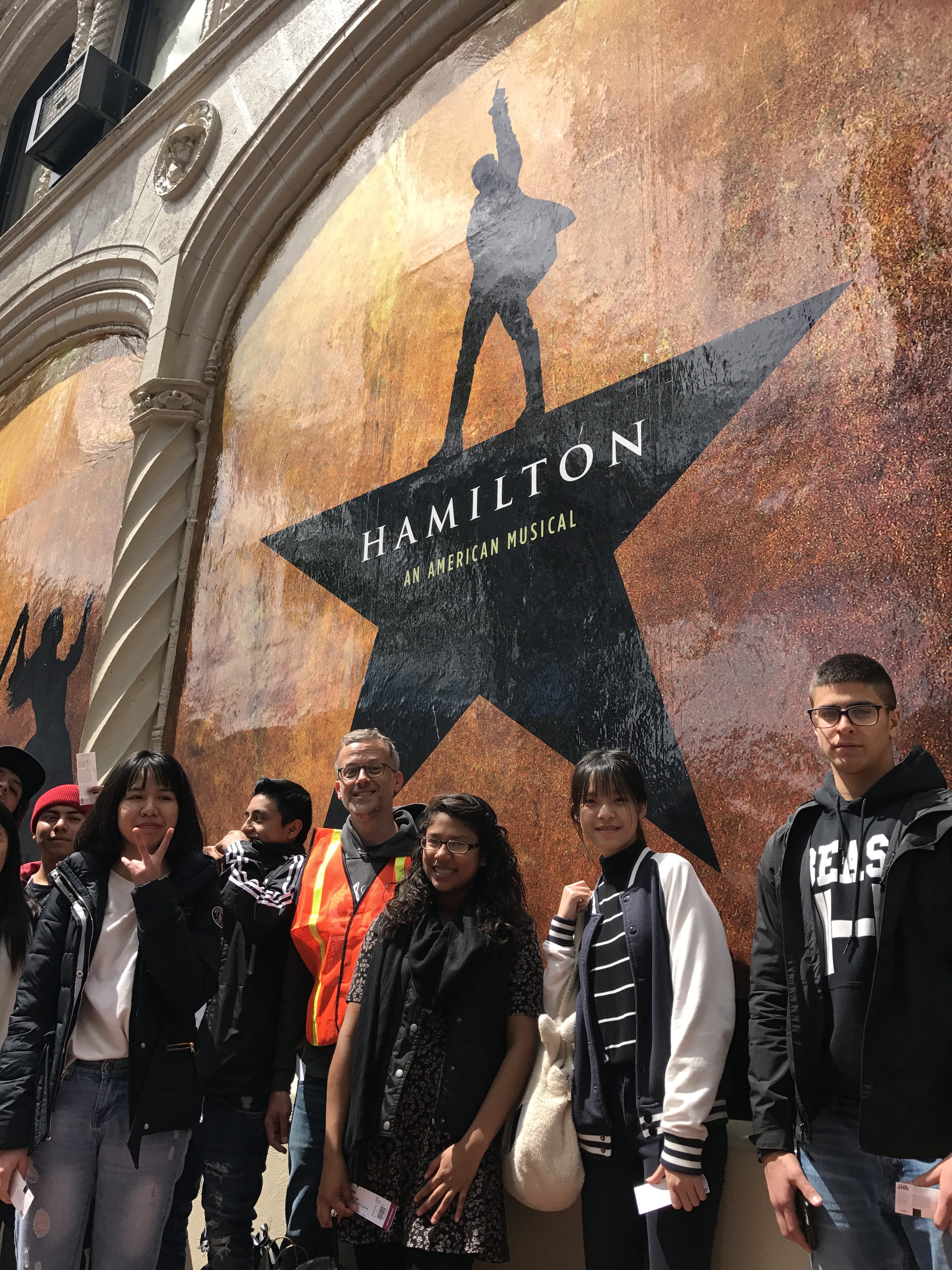 Leading up to the play, 11th and 12th graders studied the founding era of the United States and produced their own creative pieces about the time period. Two 11th graders, Yawen and Jinghao, wrote a poem about the Boston Massacre in Chinese and in English. (See it below in both languages.) Their performance was selected by the Hamilton cast, and they performed it live on stage at the Orpheum Theater.  Check it out here: