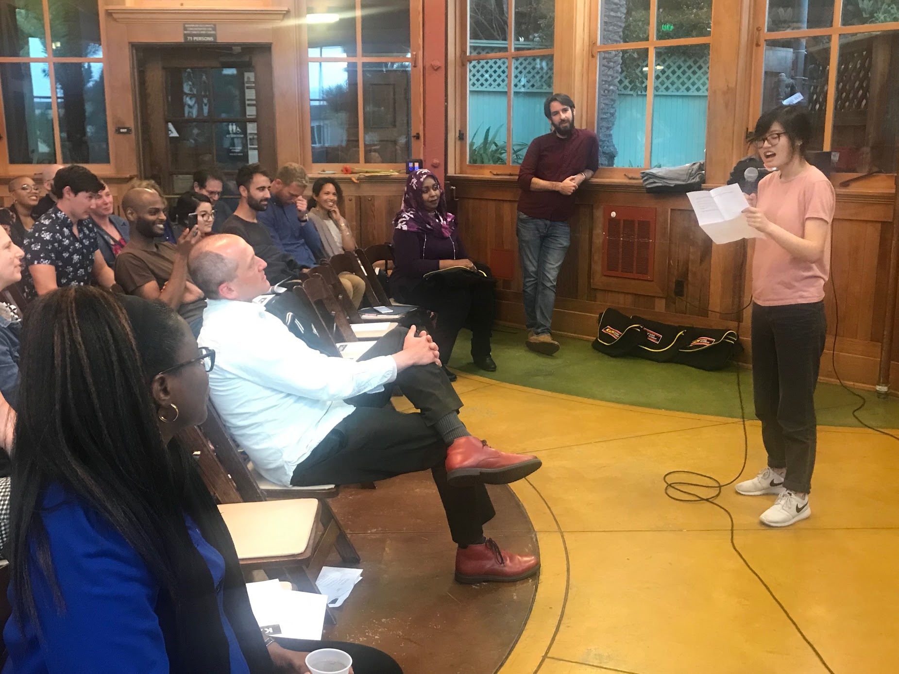 Lisa Wang speaks at the 2019 KALW Audio Academy graduation while Ben Trefny (white shirt) and other Audio Academy and KALW employees listen. Photo credit: Marissa Ortega-Welch.