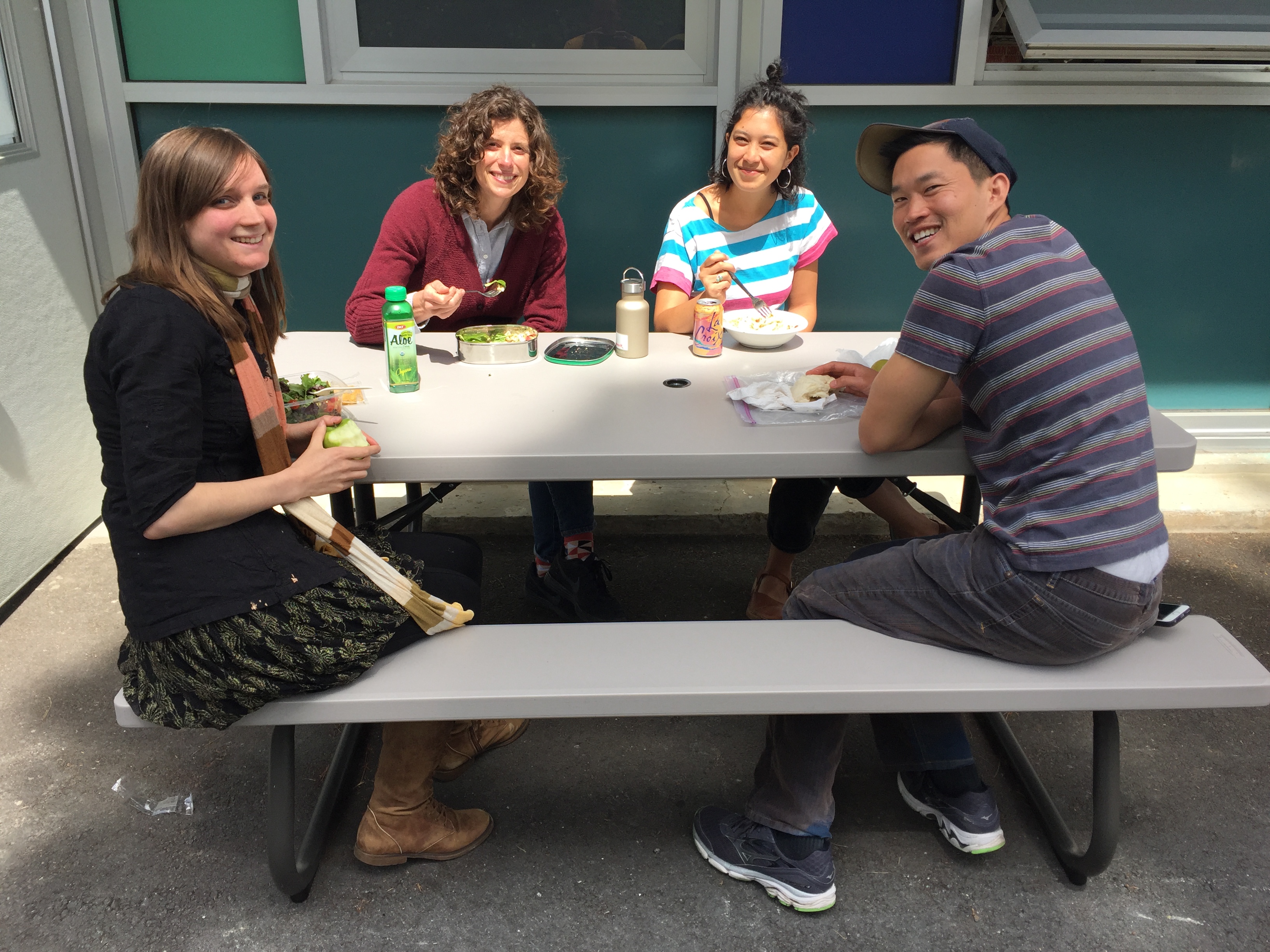 Holly J. McDede, Cari Spivack (’17), Hannah Kingsley-Ma (’15), and Jeremy Jue (’17) meet over lunch outside KALW’s newsroom.