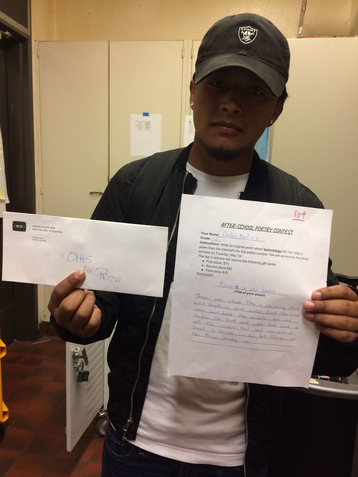 Me-ow! Carlos holds his winning poem for all to see. Congratulations Carlos!