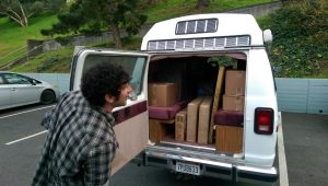 Andrew Stelzer loads equipment KALW purchased for the Storytelling Project into a van for delivery to Solano State Prison.